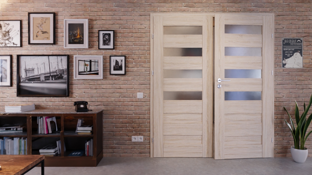 Stylowe 2-skrzydłowe drzwi wewnętrzne z satynowanymi wstawkami szklanymi