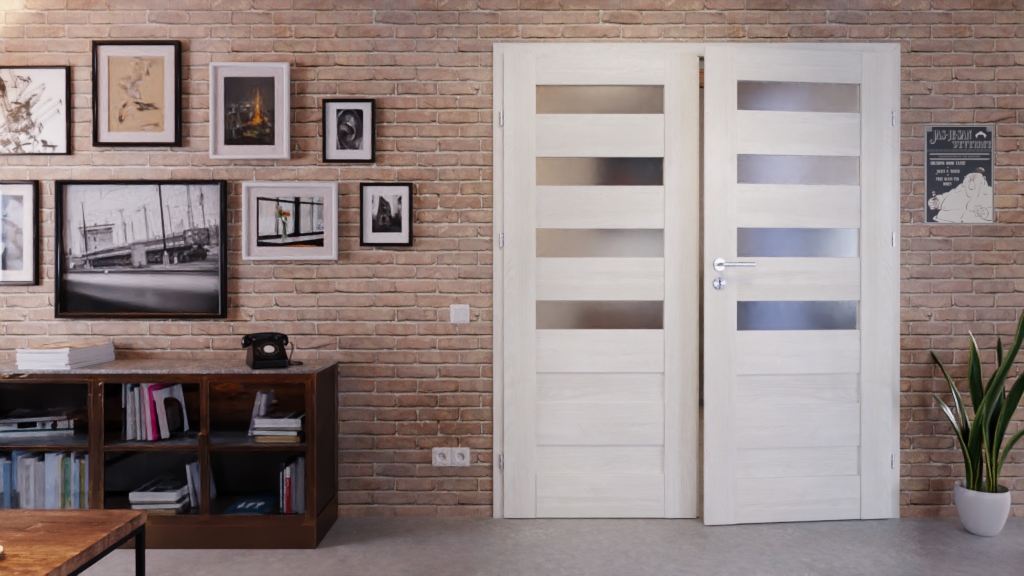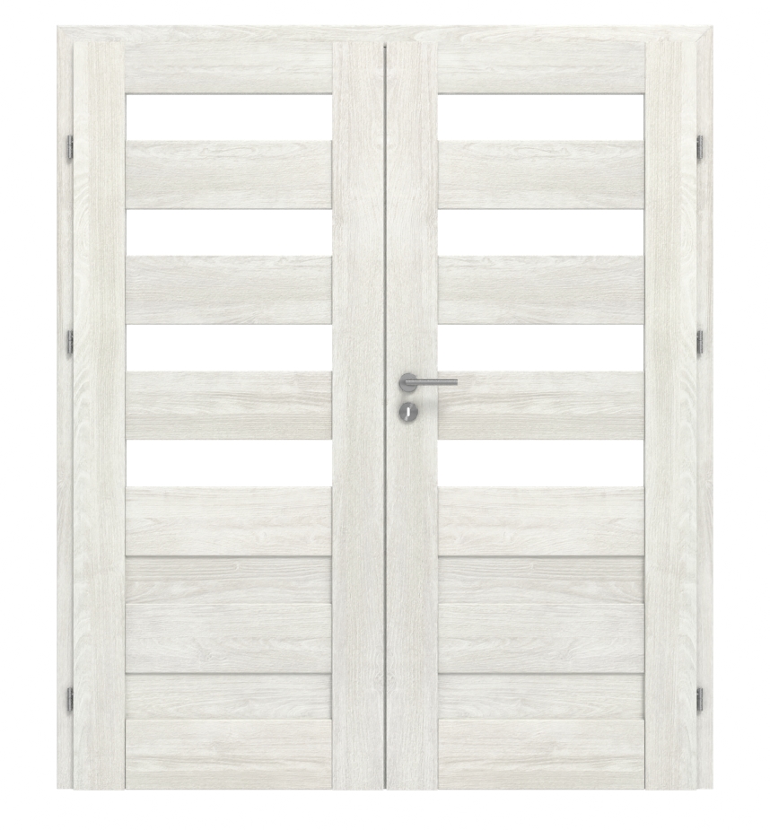 W przypadku tych drzwi podwójnych ramy skrzydeł wykonane z płyt MDF, powierzchnia CPL w dekorze Norweski Jesion, a także satynowe przeszklenia i panele HDF tworzą idealny komplet: