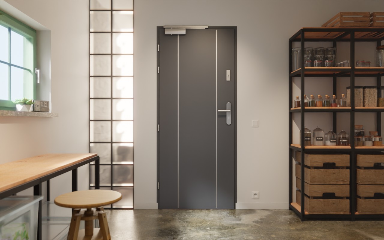 Eleganckie drzwi przeciwpożarowe wraz z opuszczaną uszczelką podłogową i samozamykaczem drzwiowym górnym: