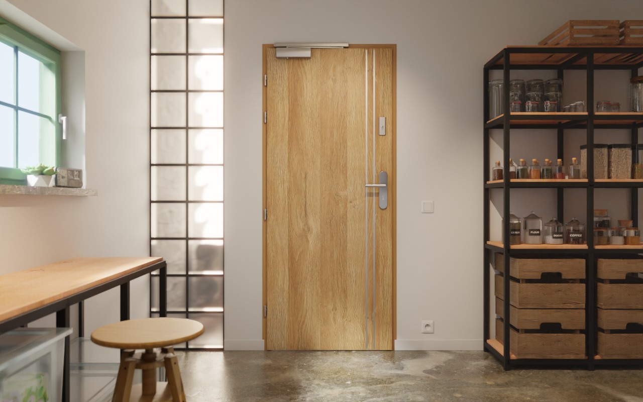 Nowoczesne drzwi przeciwpożarowe z dołączonym samozamykaczem drzwiowym górnym i zintegrowaną uszczelką opadającą: