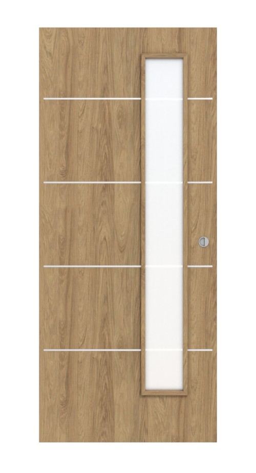 Wąski szklany wlot w środku drzwi wpuszcza delikatne światło do Twojego wnętrza. Design uzupełniają cztery poziome paski, które elegancko rozciągają się nad drewnianą powierzchnią i szkleniem.