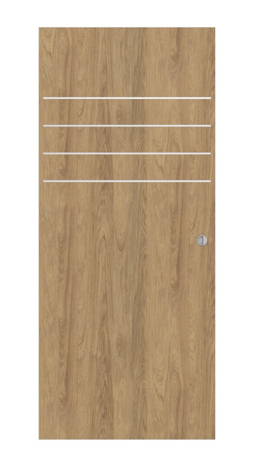 Brązowa warstwa wierzchnia nadaje Twojemu wnętrzu autentyczny charakter. Cztery poziome listwy w górnej części skrzydła drzwi wprowadzają stylowe akcenty i zapewniają harmonijną różnorodność w designie.