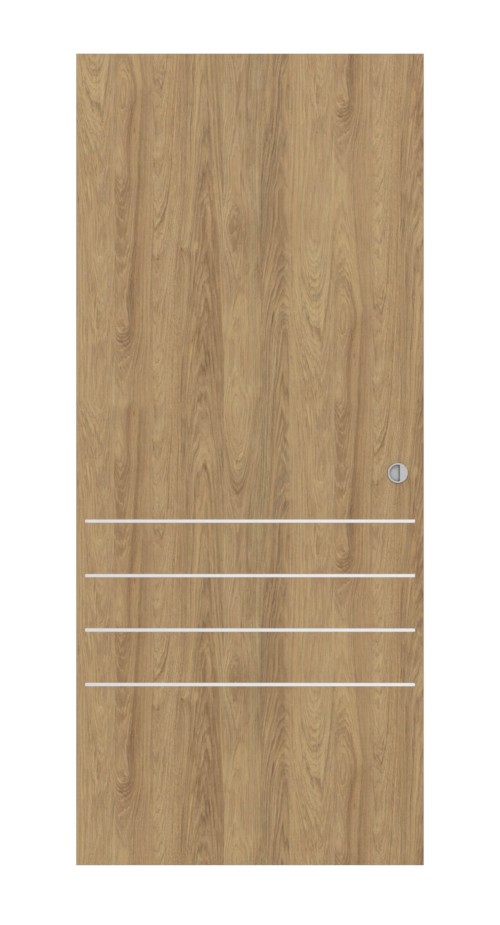 Autentyczność jest tutaj w centrum uwagi: dekor dębowy zachwyca naturalnym wyglądem i ciepłą estetyką. Projekt uzupełniają cztery subtelne, poziome listwy w dolnej części skrzydła drzwi.