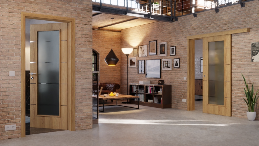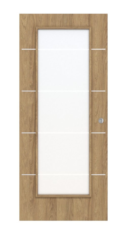 Ciepły brąz łatwo łączy się z innymi kolorami, tworząc harmonijną bazę. Szeroki otwór świetlny zapewnia otwarty i przyjazny design wnętrza. Cztery równomiernie rozmieszczone paski uzupełniają skrzydło drzwi i nadają projektowi nowoczesny akcent.