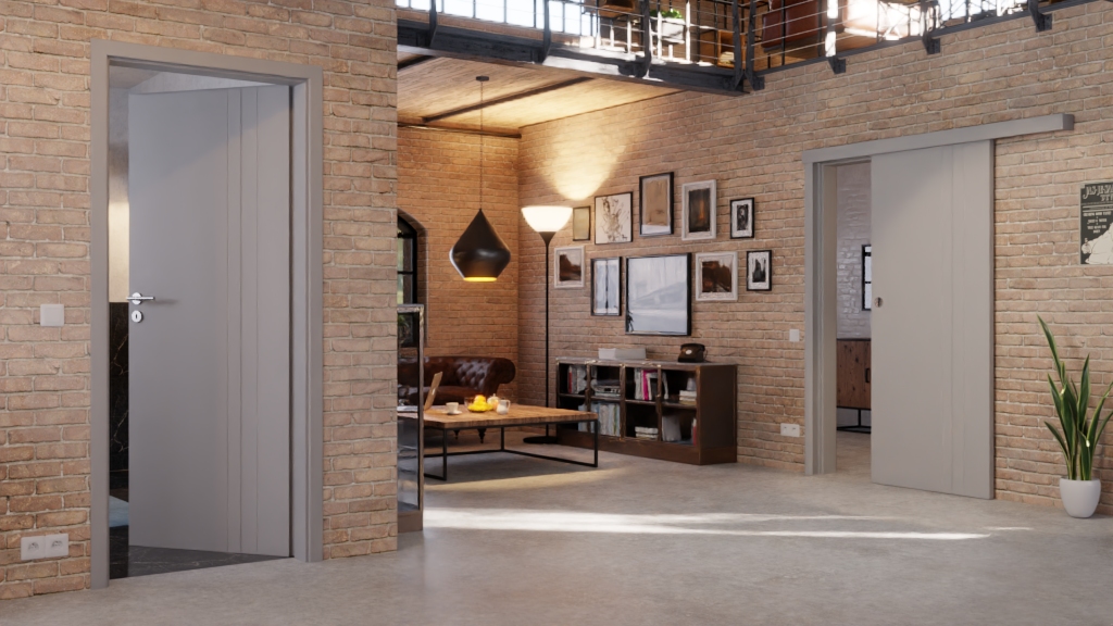 Drzwi przesuwne z estetyczną powierzchnią lakierowaną w kolorze szarym RAL 7004