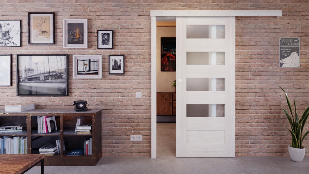 • Zakres dostawy: Skrzydło drzwiowe, muszla drzwi przesuwanych, prowadnica podłogowa, szklenie