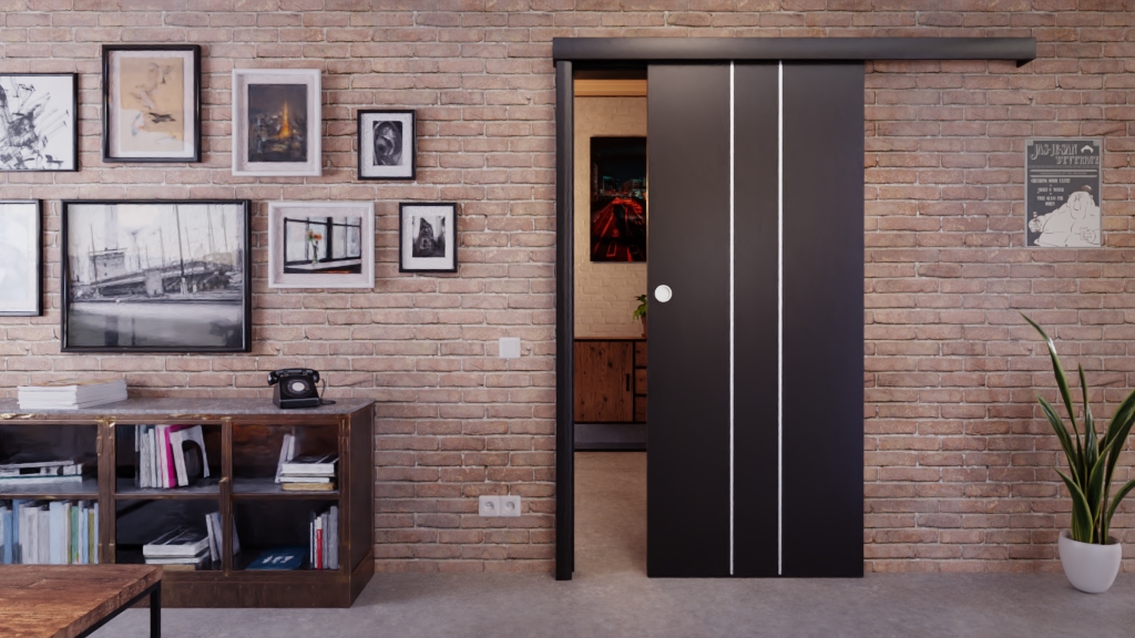 Drzwi przesuwne ozdobione profilami aluminiowymi o solidnej konstrukcji: