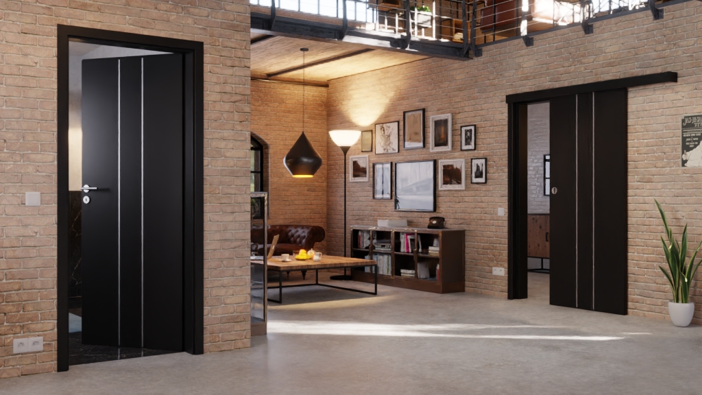 Stabilne drzwi pokojowe w kolorze Uni Black z nowoczesnymi elementami stylistycznymi.