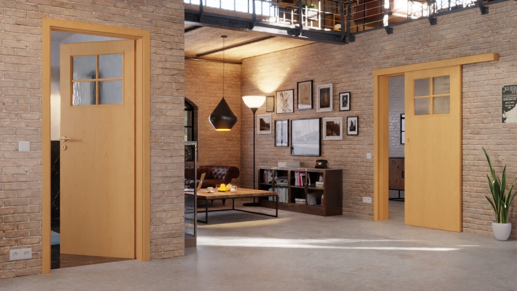 • Szyba: w standardzie ze szkłem ornamentowym, z nakładanymi listwami przyszybowymi i ramą ze szprosów