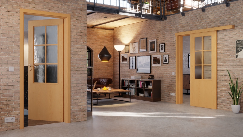 • Szyba: w standardzie ze szkłem ornamentowym, z nakładanymi listwami przyszybowymi i ramą ze szprosów