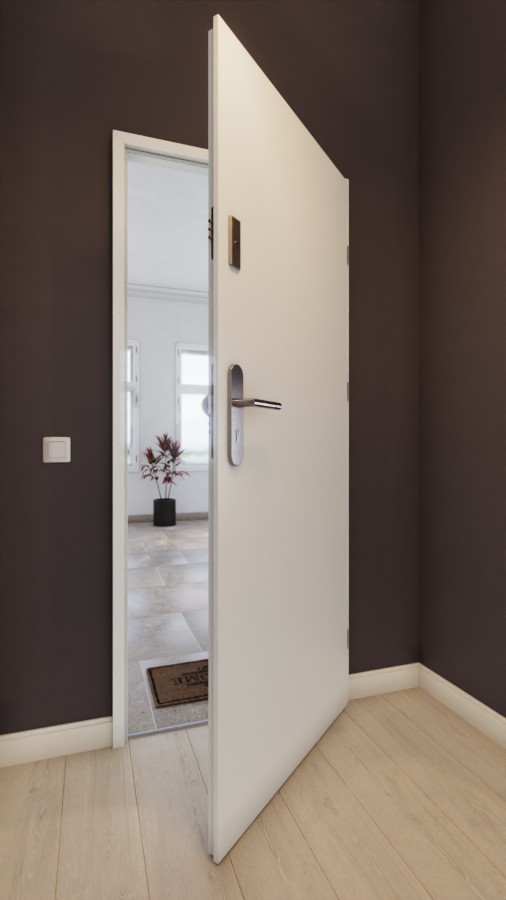 Stylowe drzwi wejściowe ze wzmocnioną ramą z miękkiego drewna i opcjonalną stalową płytą ochronną: