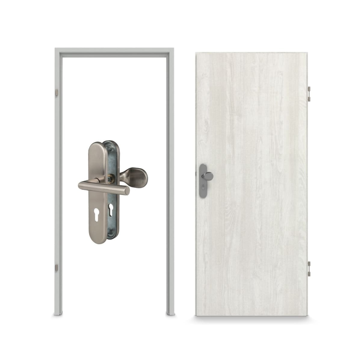• Zakres dostawy: Skrzydło drzwiowe, zawiasy, zamek cylindryczny, obniżana uszczelka podłogowa, ościeżnica blokowa, uszczelka ościeżnicy, okucia