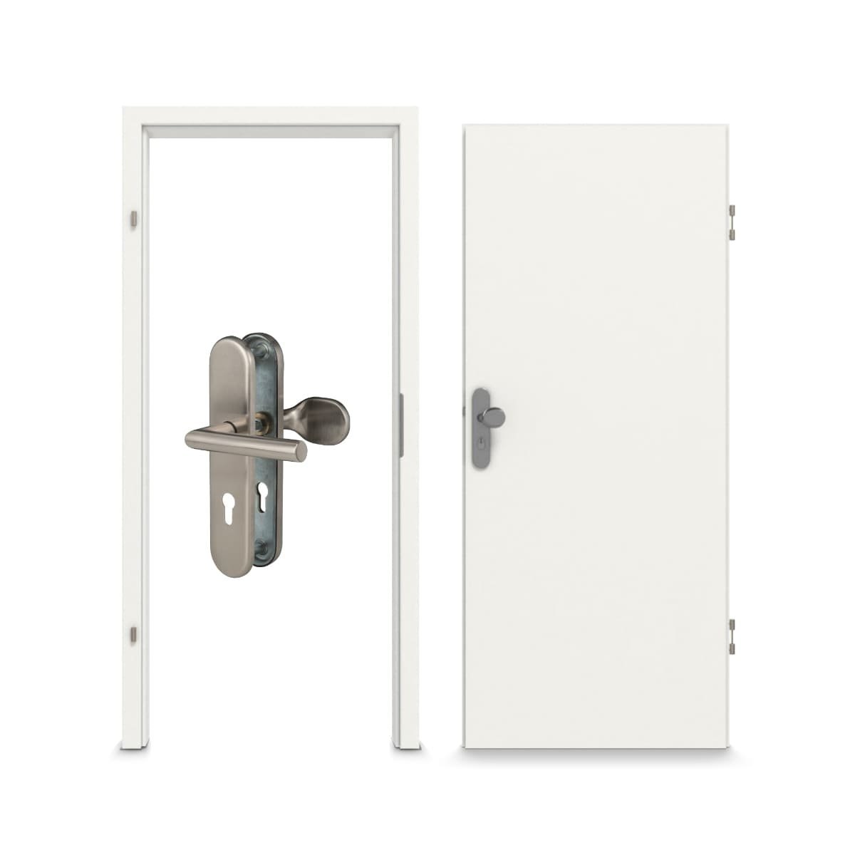 Praktyczny zestaw drzwi wejściowych do mieszkania składający się z ościeżnicy, skrzydła drzwiowego oraz okucia:
