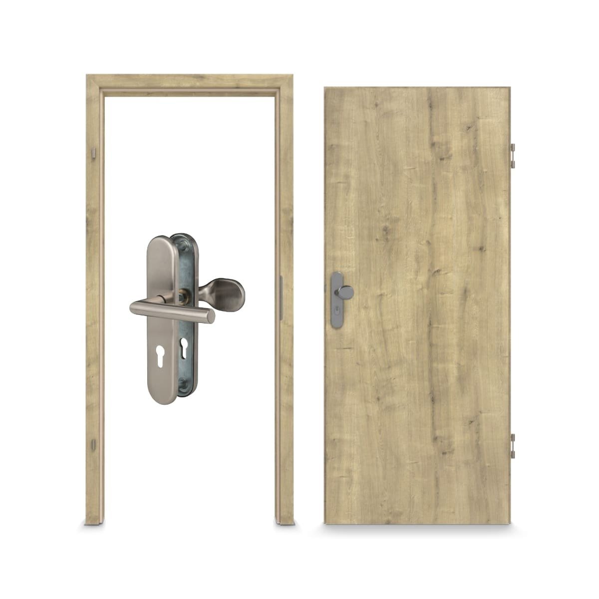 Skrzydło drzwiowe charakteryzuje się płytą wiórową oraz opuszczalną uszczelką dolną. W cenie zawarte są również zamek cylindryczny oraz zawiasy w wersji 3-częściowej.