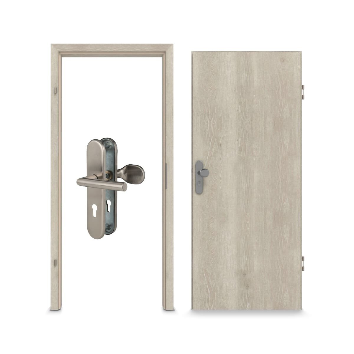 W skład kompletnego zestawu wchodzą: płyta wiórowa o pełnej grubości, opuszczana uszczelka podłogowa, 3-częściowe zawiasy oraz zamek profilowy.