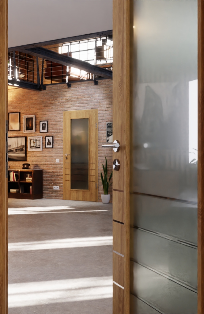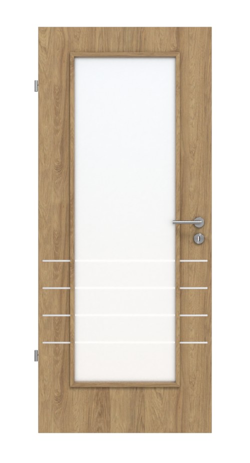 Te drzwi wyróżniają się obszernym przeszkleniem, które w połączeniu z autentyczną powierzchnią tworzy harmonijny wygląd. Zapewnia jasną, przyjazną atmosferę, ponieważ do pomieszczenia wpada dużo światła. Wymagana szklenie jest już w cenie. Design uzupełniają cztery subtelne paski w dolnej części skrzydła drzwi, które nadają luźniejszy wygląd.