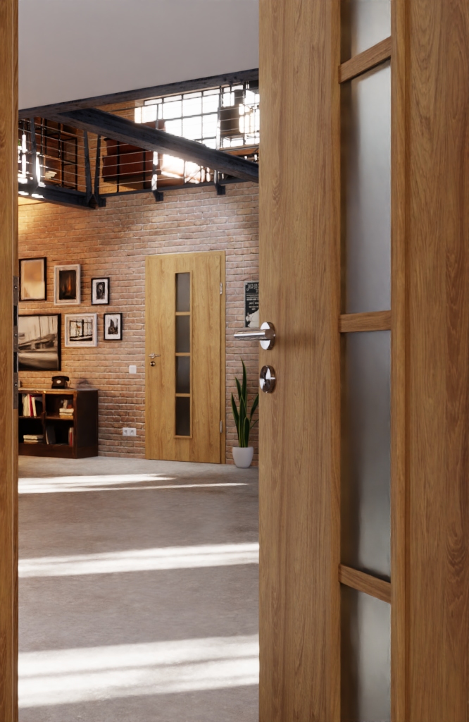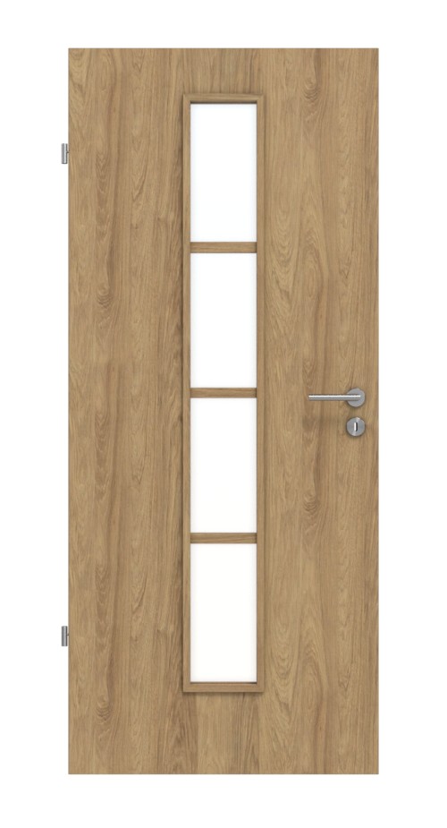 Mieszanka brązowego dekoru dębowego i centrowanego, wąskiego przeszklenia tworzy przyjazną atmosferę w Twoim wnętrzu. W przypadku szkła masz do wyboru design przezroczysty lub matowy.