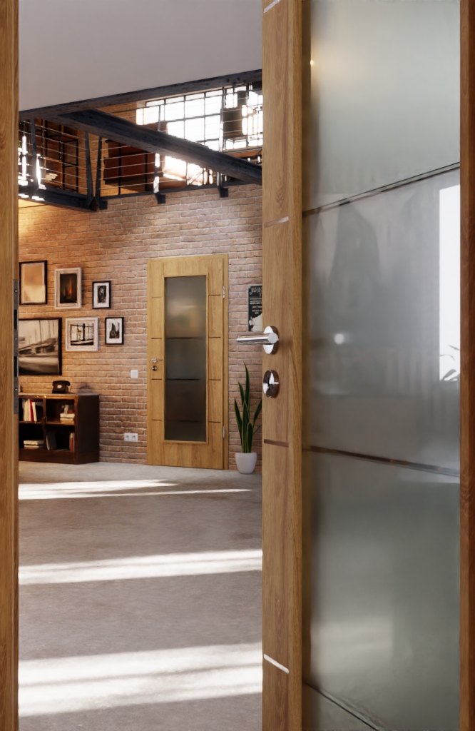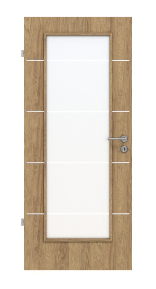 Ciepły brąz łatwo łączy się z innymi kolorami, tworząc harmonijną bazę. Szeroki otwór świetlny zapewnia otwarty i zapraszający design wnętrza. Cztery równomiernie rozmieszczone paski uzupełniają skrzydło drzwi i nadają projektowi nowoczesny akcent.