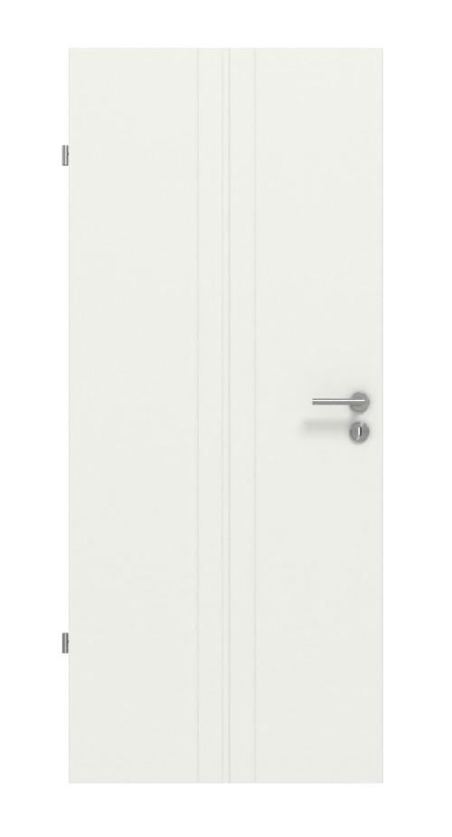 Centralnie przebiegają pionowo trzy wytłoczone linie przez całe skrzydło drzwi. Biała lakierowana powierzchnia obiecuje przyjazny i elastyczny charakter.