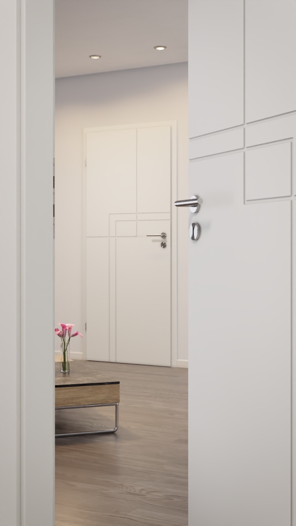 Białe drzwi wewnętrzne ze stabilną, obwodową ramą MDF w kolorze RAL 9003: