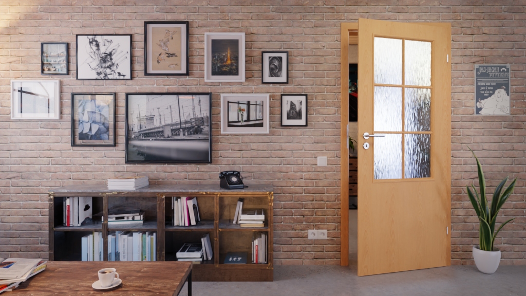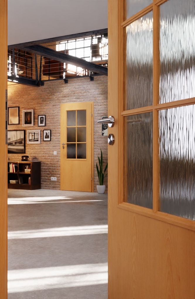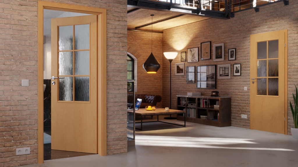 • Szyba: w standardzie ze szkłem ornamentowym, z nakładanymi listwami przyszybowymi i ramą ze szprosów