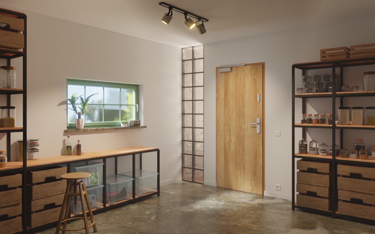 • Drzwi przeciwpożarowe EI30 z automatycznym mechanizmem zamykającym