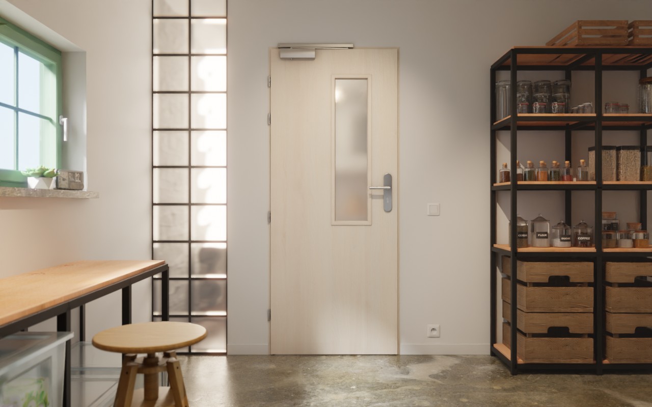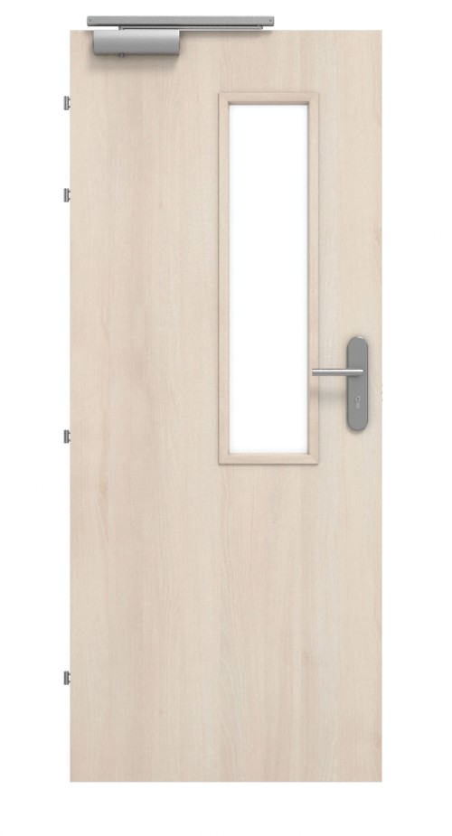 Estetyczne drzwi przeciwpożarowe z czterema srebrnymi zawiasami: