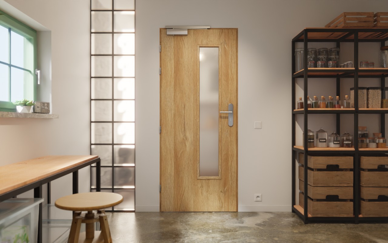 Przeciwpożarowe drzwi funkcyjne wraz z samozamykaczem drzwiowym górnym: