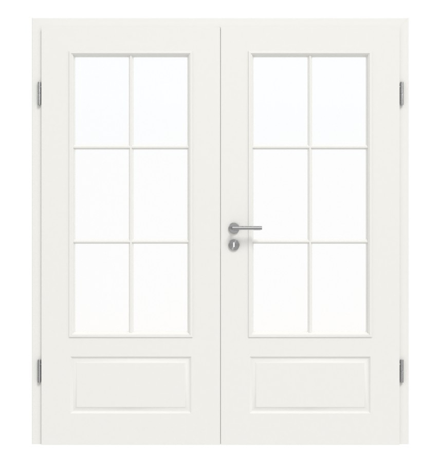 Duże ramy ze szprosami składają się z sześciu powierzchni, które współgrają ze sobą, zapewniając interesujące wykończenie wizualne i dopływ światła. Pod spodem w każdym skrzydle drzwiowym znajduje się prostokątny panel, który przyciąga wzrok.