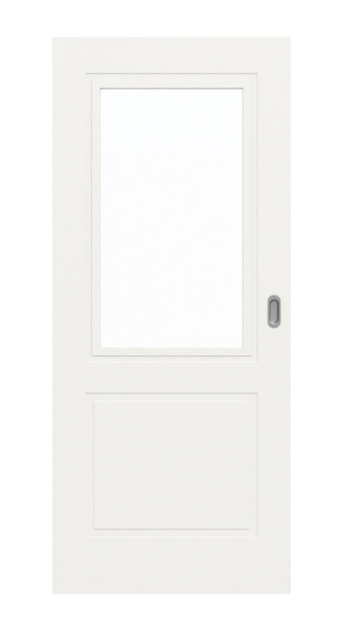 Wykładka szklana z listwami wpuszczanymi w płaszczyznę zajmuje górną połowę skrzydła drzwi. Pod spodem znajduje się nieco mniejsze wypełnienie z dyskretnymi frezowaniami, które dopełniają wizualnie ten udany efekt całościowy. Czysty odcień bieli RAL 9016 nakłada się w ramach wielowarstwowego procesu lakierowania .