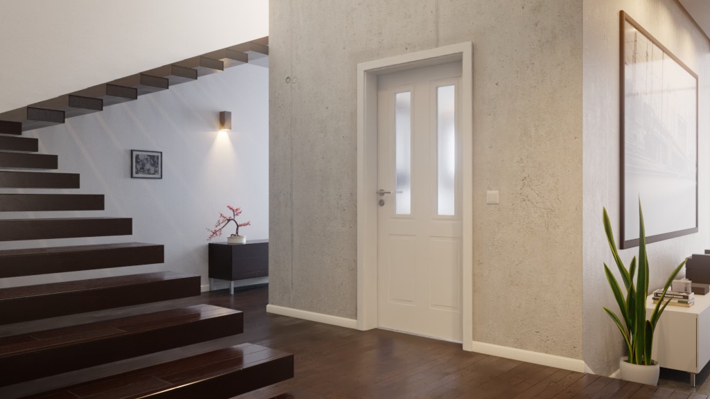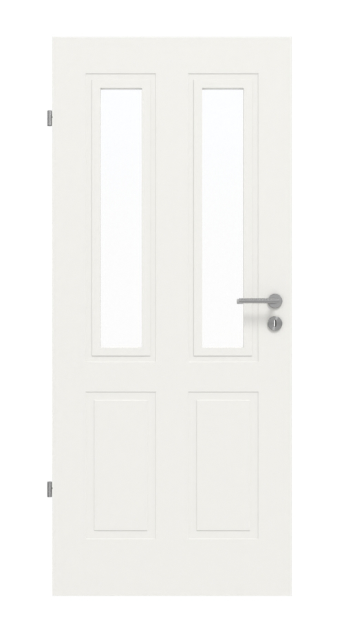 Skrzydło drzwiowe składa się z dwóch części: Górną połowę stanowią dwa podłużne otwory świetlne wraz z listwami przylegającymi do powierzchni . Wśród nich znajdują się nieco krótsze wypełnienia z dyskretnie wkomponowanymi frezowaniami . Czysty odcień bieli RAL 9016 nakłada się w ramach wielowarstwowego procesu lakierowania .