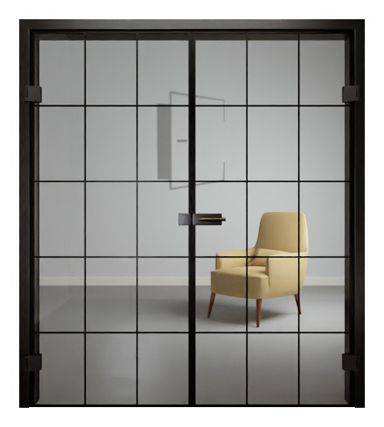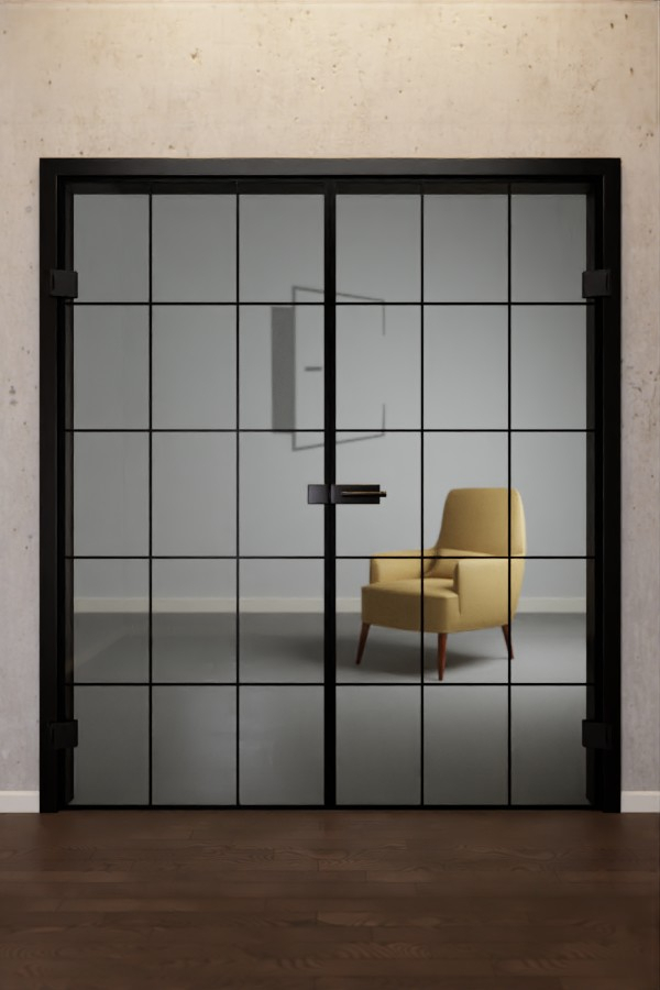 Wąskie prostokąty z czarną ramą zdobią przestronne drzwi podwójne. Geometryczny wzór tworzy wyraźne oświadczenie projektowe w Twoim domu.