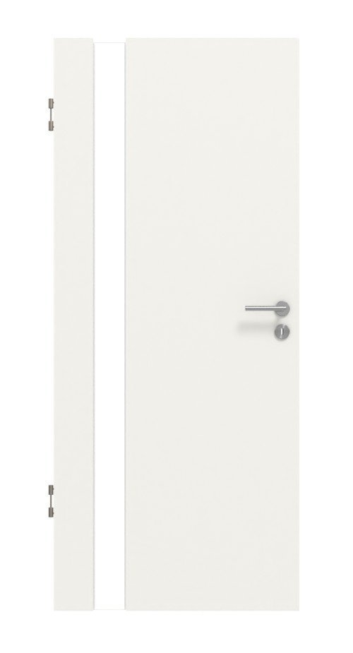 Połączenie dekoru białego i podłużnego pasa świetlnego po stronie zawiasowej nadaje drzwiom wyjątkowo elegancki wygląd. Powierzchnia pokryta białym lakierem ma standardowo kolor RAL 9016. Za dodatkową opłatą można również zdecydować się na warstwę wierzchnią w kolorze RAL 9010.