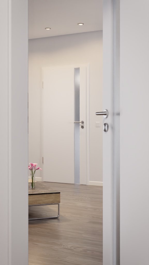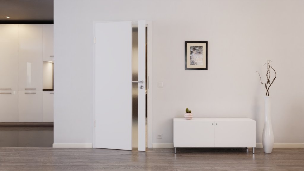 Szare usłojenie nadaje białej, gładkiej powierzchni żywy charakter. Po stronie zamka znajduje się długie okno świetlne, które zapewnia jasność w Twoim domu.