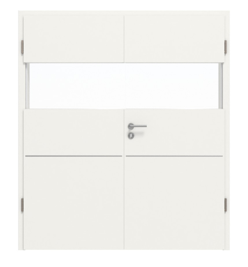 Połączenie dekoru białego i świetlika na wysokości oczu tworzy otwartą i przyjazną atmosferę w pomieszczeniu mieszkalnym. Płaska aplikacja ze stali szlachetnej pośrodku obu skrzydeł drzwi nadaje im indywidualny charakter.