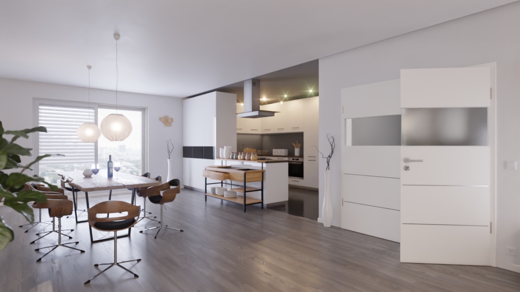 Połączenie białego dekoru i pasma świetlnego na wysokości oczu zapewnia otwartą i elegancką atmosferę w pomieszczeniu mieszkalnym. Dzięki płaskim aplikacjom ze stali szlachetnej, które biegną wzdłuż dolnej części drzwi, powstaje elegancki design.