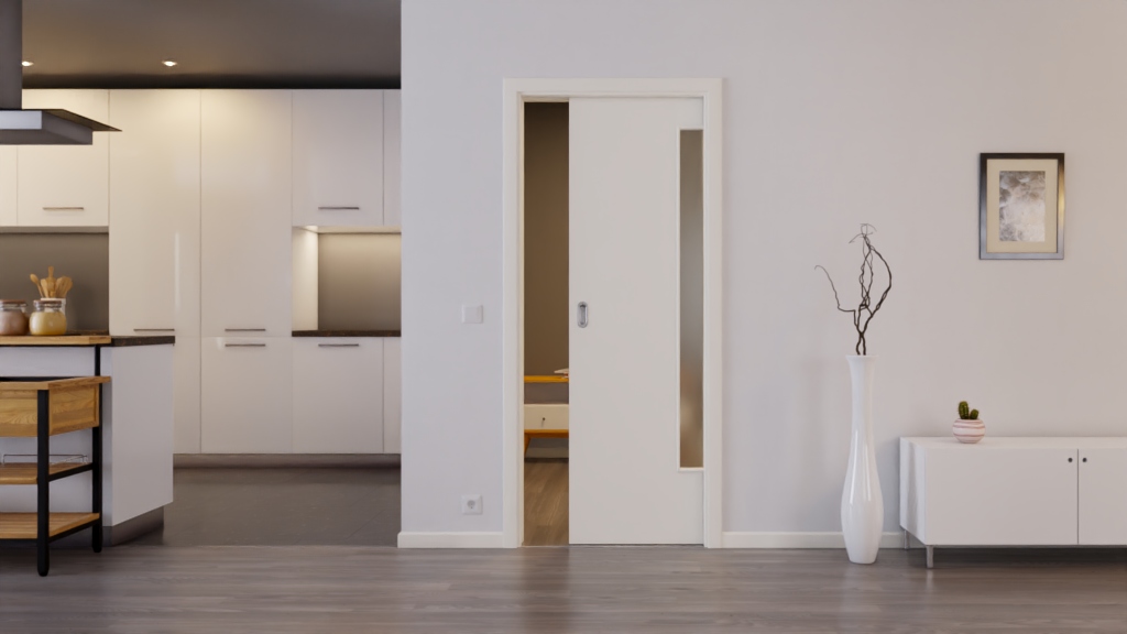 Trwałe drzwi przesuwne ProLine w czystej bieli RAL 9010 z wysokiej jakości pełną płytą wiórową: