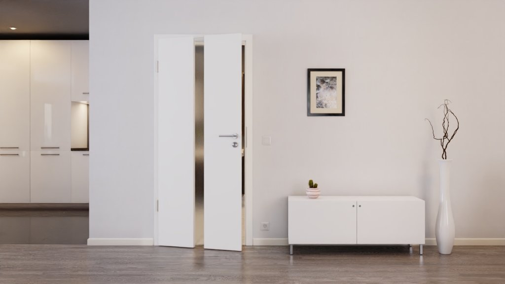 Płyta wiórowa pełna w rdzeniu zapewnia wysoką trwałość. Ościeżnica i skrzydło drzwiowe są ze sobą trwale połączone dzięki standardowym trzyczęściowym zawiasom .