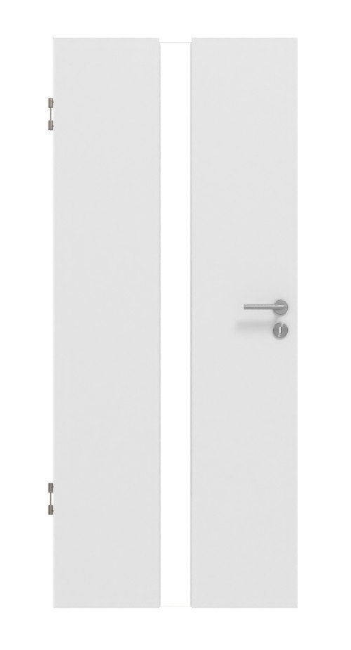 Szare usłojenie nadaje białej powierzchni naturalny wygląd. W środku modelu znajduje się pas świetlny na całej wysokości skrzydła drzwiowego. Elegancki akcent zapewnia gładka struktura powierzchni.