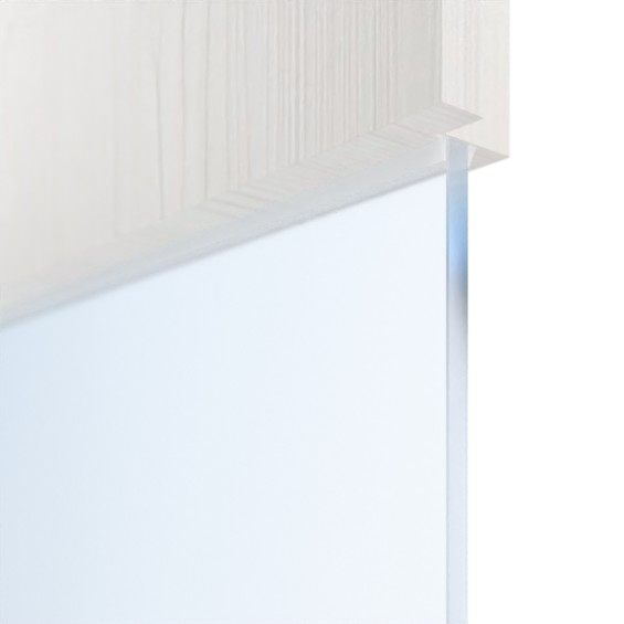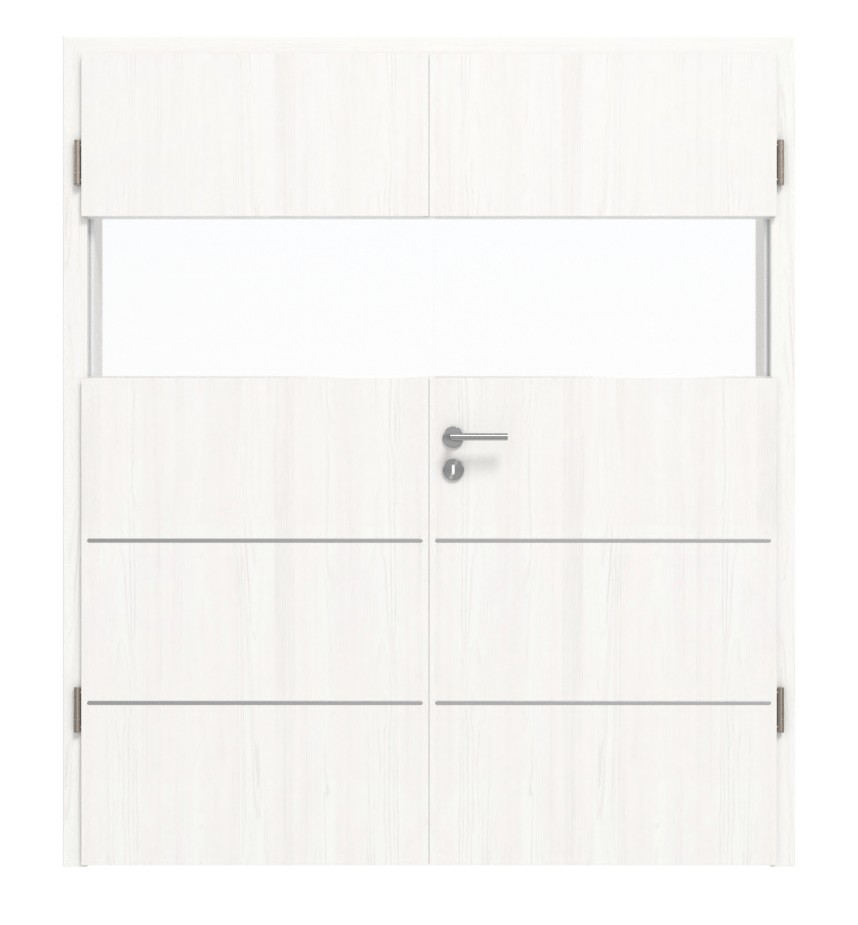 Naturalny, a jednocześnie spokojny wygląd zapewniają długie słoje, które rysują się na białym dekorze. Nałożone aplikacje ze stali nierdzewnej w dolnej części drzwi nadają modelowi elegancki akcent. Na wysokości oczu obu skrzydeł drzwi znajduje się pas świetlny.