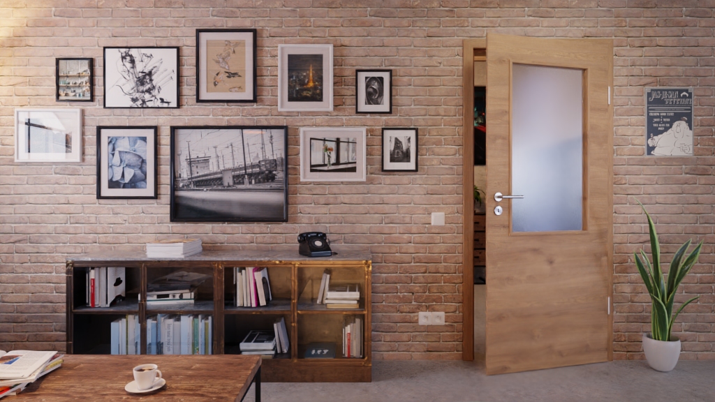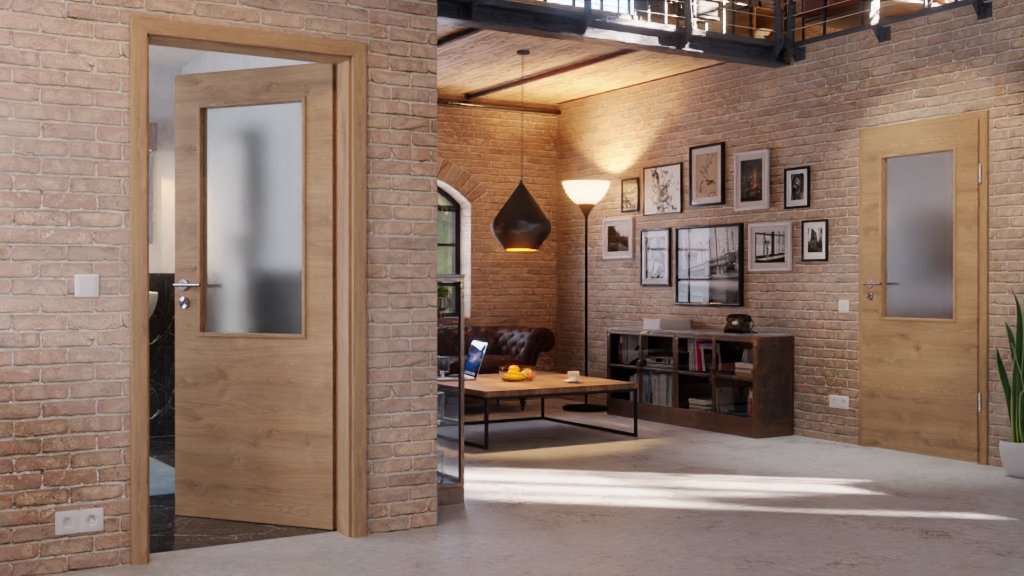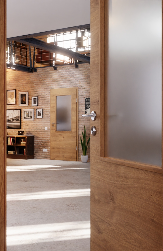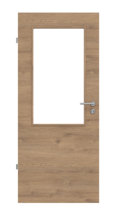 Przeszklenie dzieli drzwi wizualnie na dwie części. Dzięki temu zapewnia częściowy wgląd do pomieszczenia, a dolna część chroni przed stłuczeniem szkła.