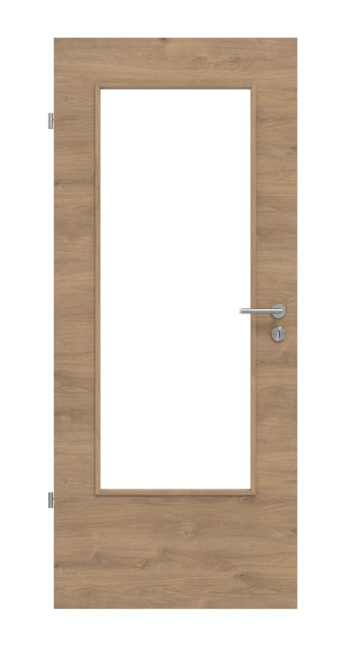 Prostokątne przeszklenie z nałożonymi listwami szklanymi nadaje nowoczesny charakter. Dzięki podwyższonej konstrukcji stanowi standard wszystkich przeszkleń. Ta podwyższona pozycja zapewnia ochronę przed stłuczeniem szkła w dolnej części drzwi.
