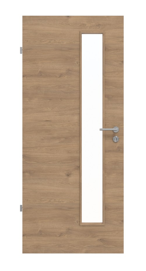 Prostokątny przeszklenie z nałożonymi listwami szklanymi tworzy nowoczesną atmosferę. Znajduje się po stronie zamka. Dzięki temu zyskujesz więcej światła przy zamku i klamce. Ponadto, dzięki wysokości, od razu widać, kto znajduje się po drugiej stronie drzwi.