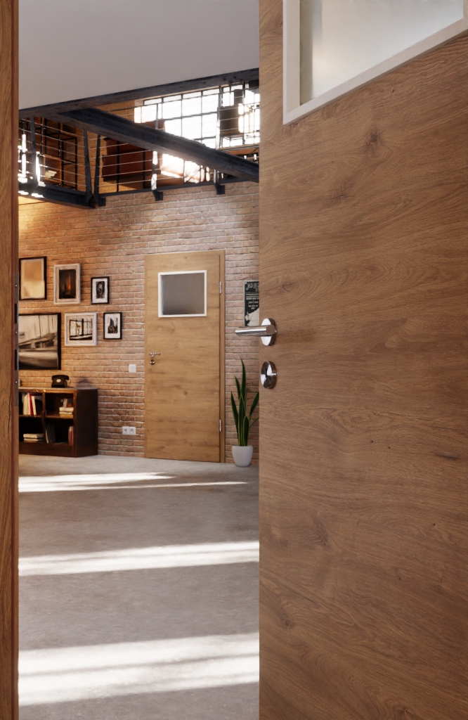 Drzwi wewnętrzne są odporne na wpływy zewnętrzne, takie jak uderzenia, uszkodzenia i wilgoć, a także są odporne na zarysowania i ścieranie. Dzięki specjalnej obróbce powierzchni powstaje warstwa bez porów. Możesz wybierać spośród następujących wkładów drzwiowych: płyta wiórowa i płyta pełna.