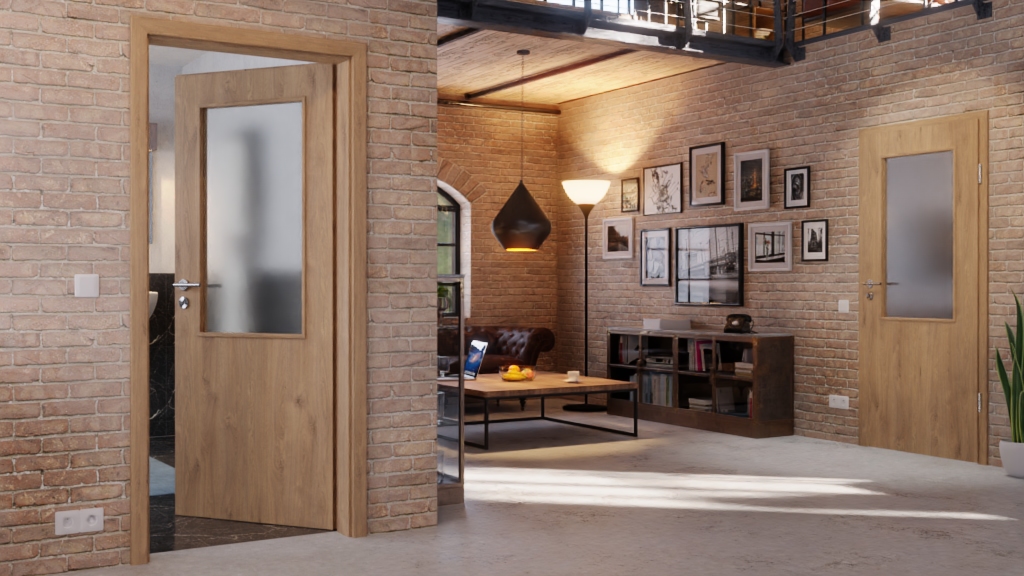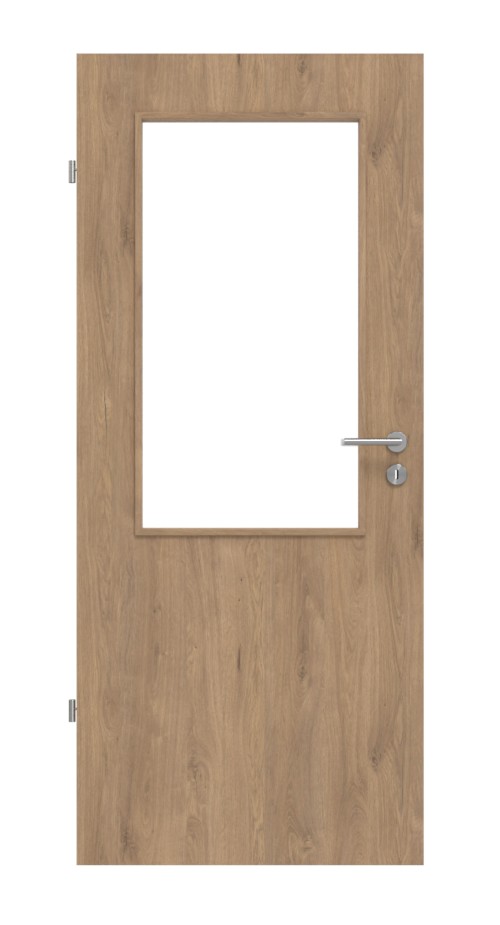 Przeszklenie dzieli drzwi wizualnie na dwie części. Dzięki temu zapewnia częściowy wgląd do pomieszczenia, a dolna część chroni przed stłuczeniem szkła.