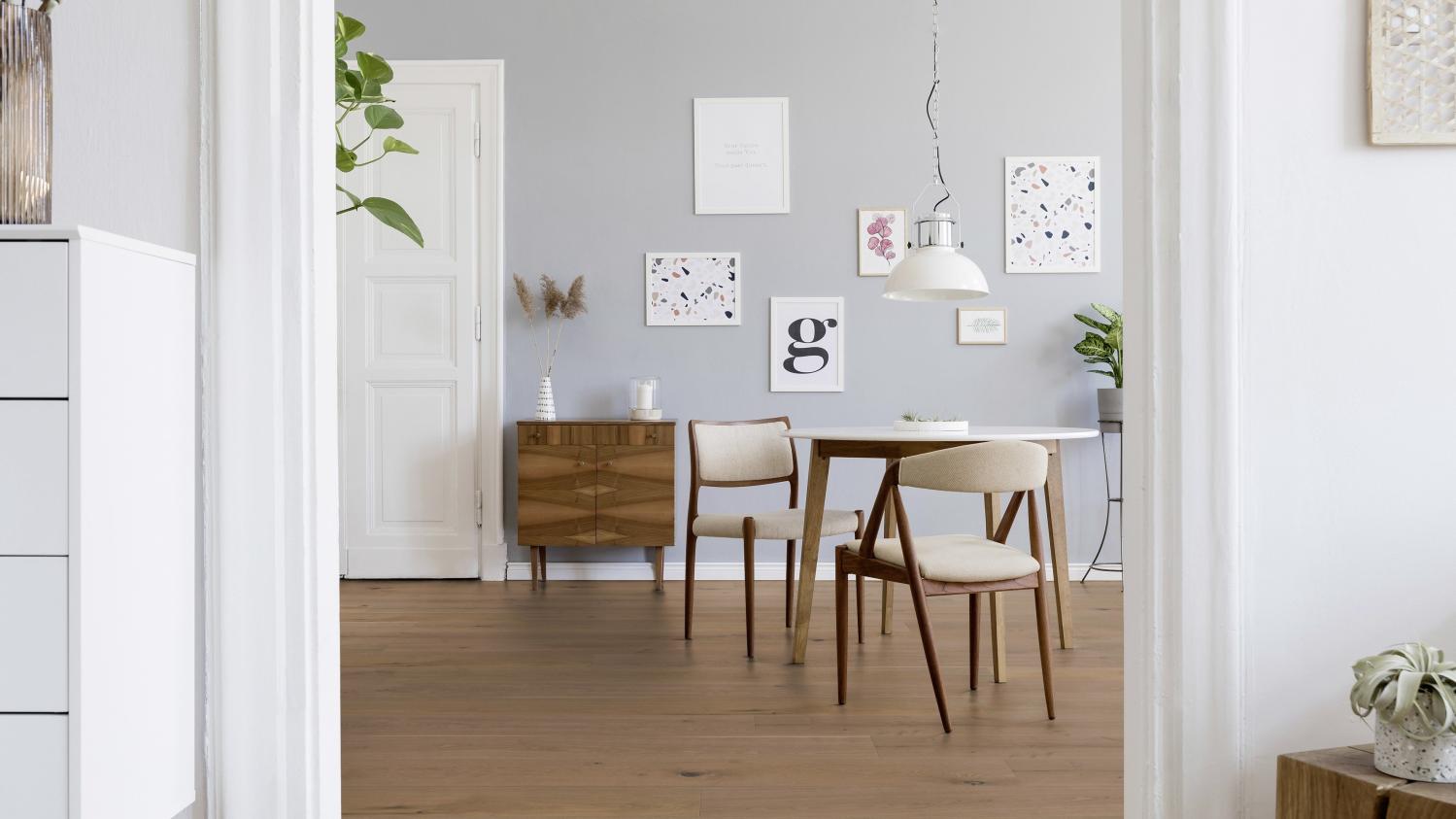 Naturalny unikat: Deski zamkowe z dębu authentic szary szczotkowany z kolekcji Lindura HD 400 firmy MEISTER szczególnie dobrze prezentują się w dużych pomieszczeniach.