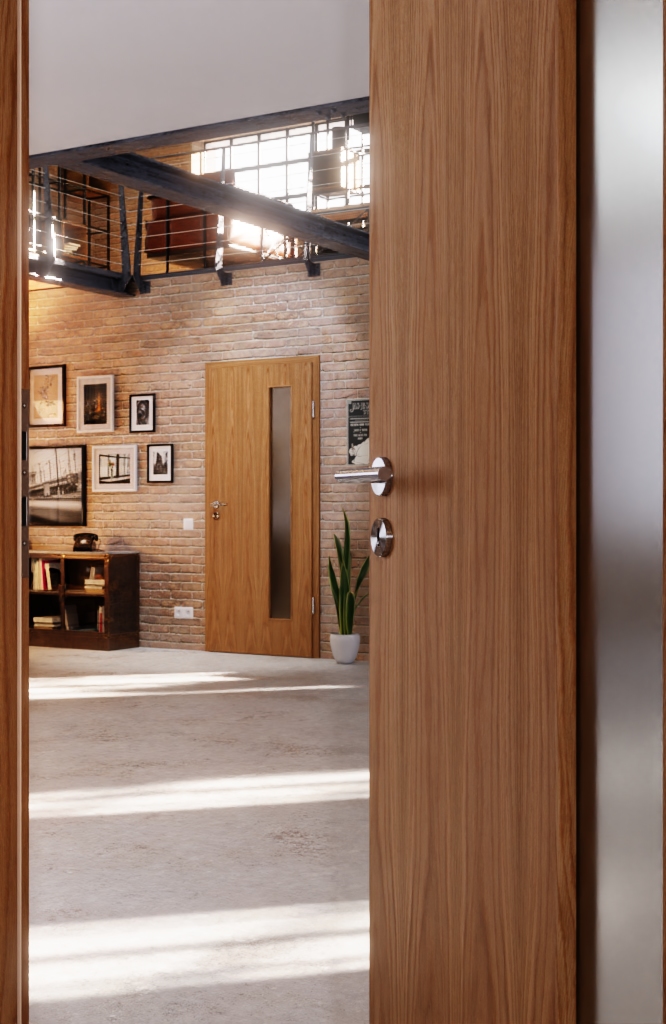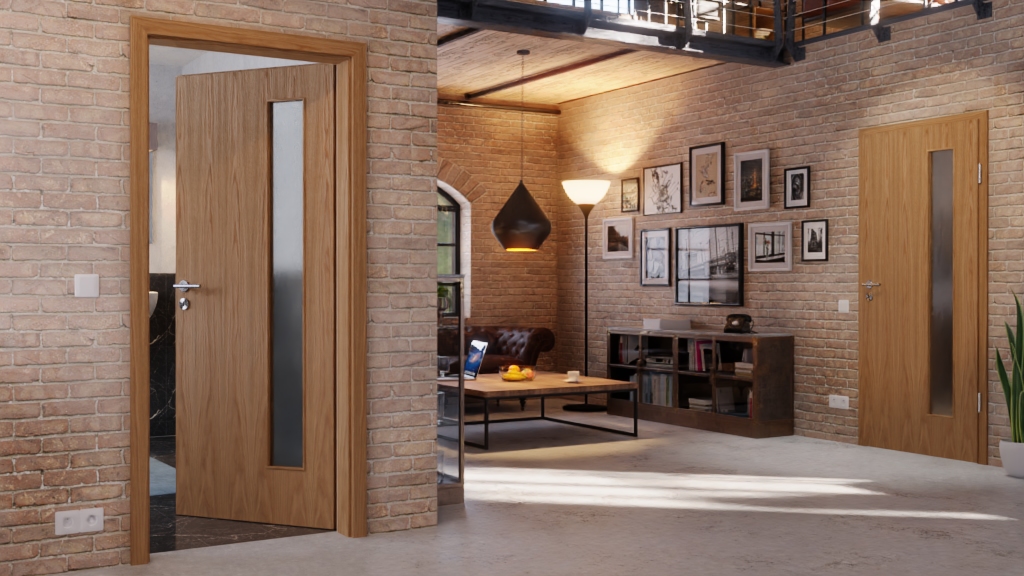 Zrównoważone drzwi drewniane z wycięciem na szybę; Wytrzymały fornir drewniany w kolorze dąb Classic i naturalny wygląd to charakterystyczne cechy drzwi wewnętrznych Optima firmy Jeld-Wen z otworem świetlnym.