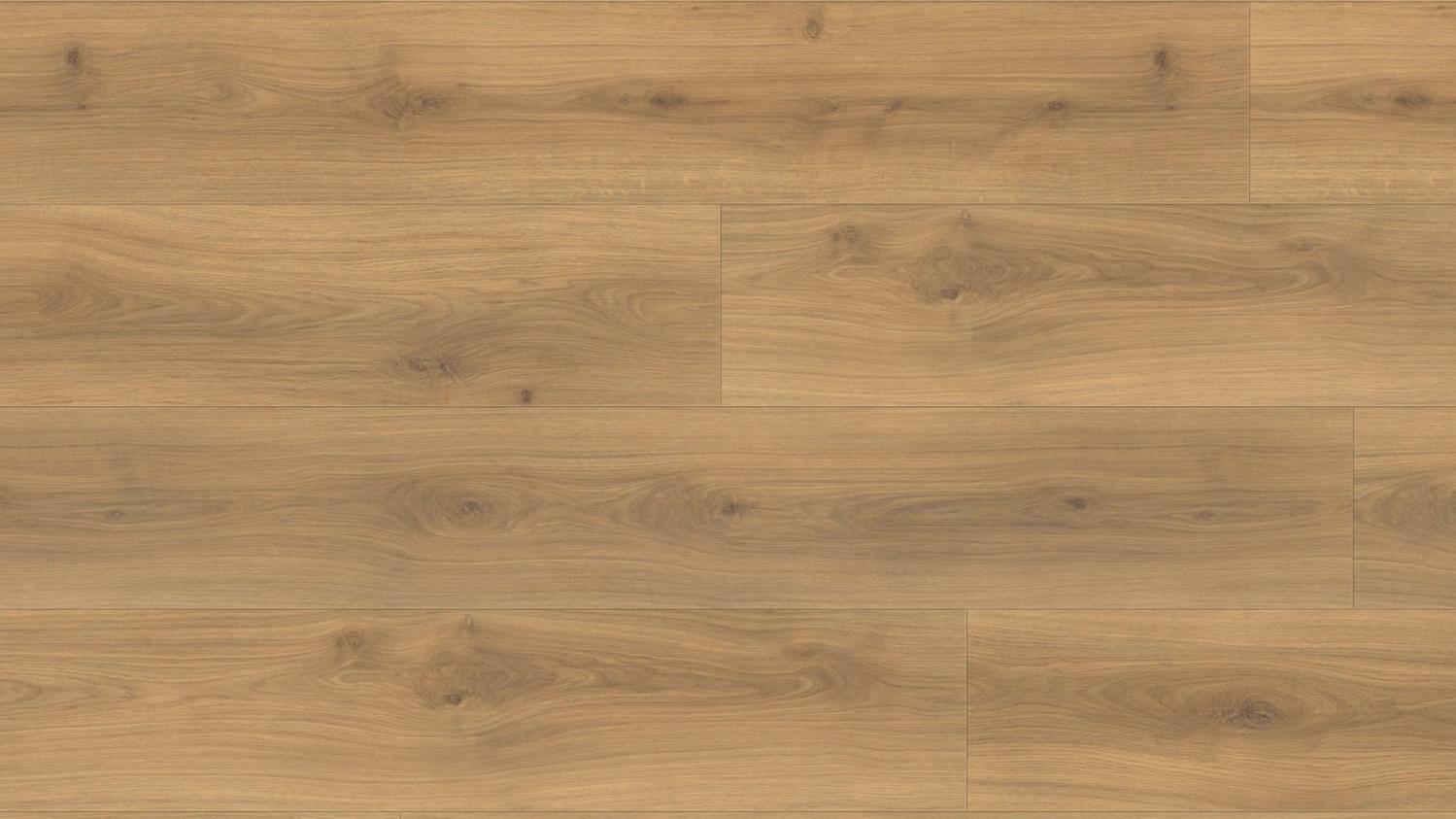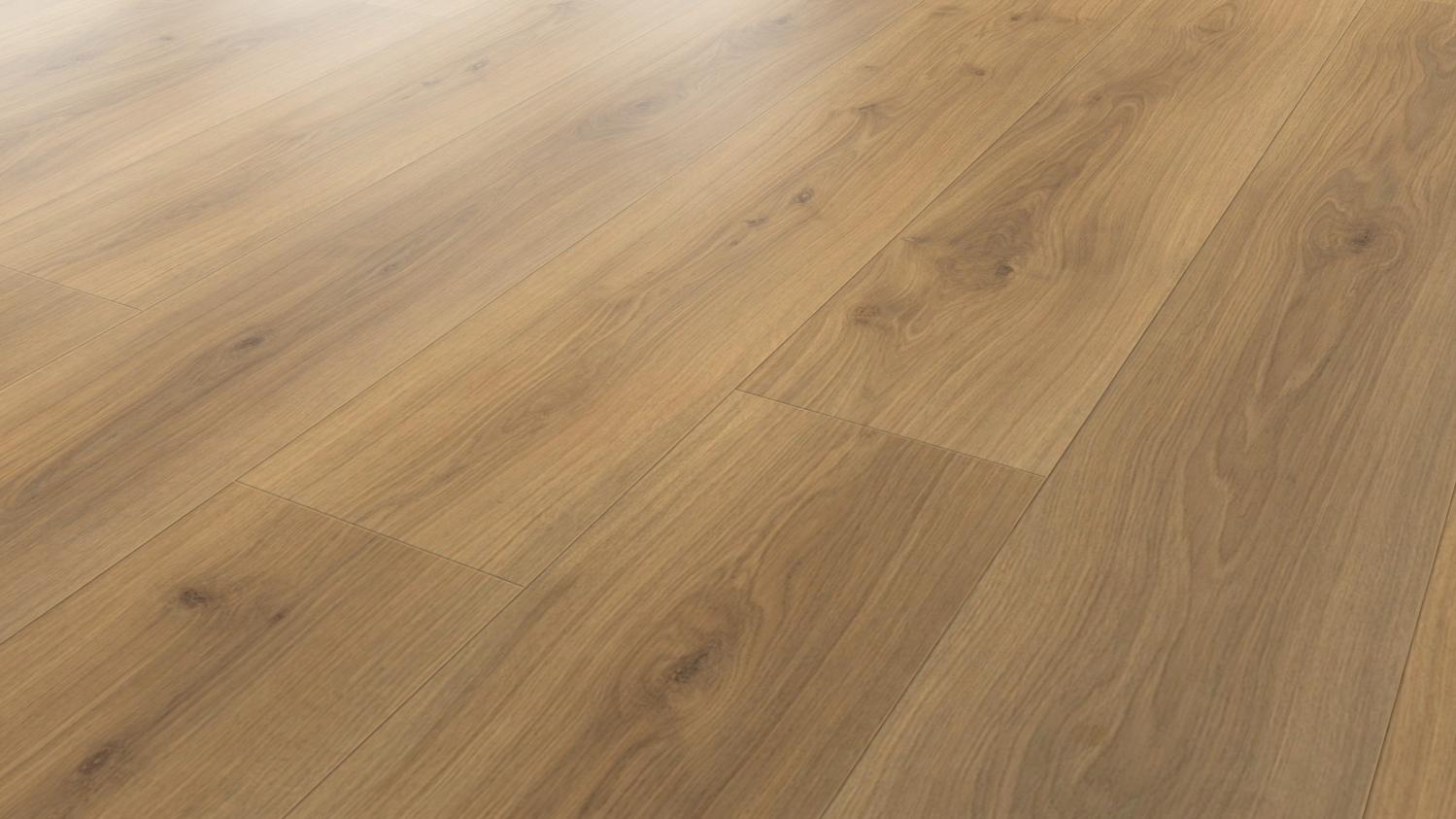 Łatwe w pielęgnacji i trwałe: Dzięki panelom laminowanym o wyglądzie dębu Emilia w kolorze miodowym authentic soft z serii TRITTY 100 Gran Via firmy Haro zyskasz wytrzymałą podłogę w swoim salonie.
