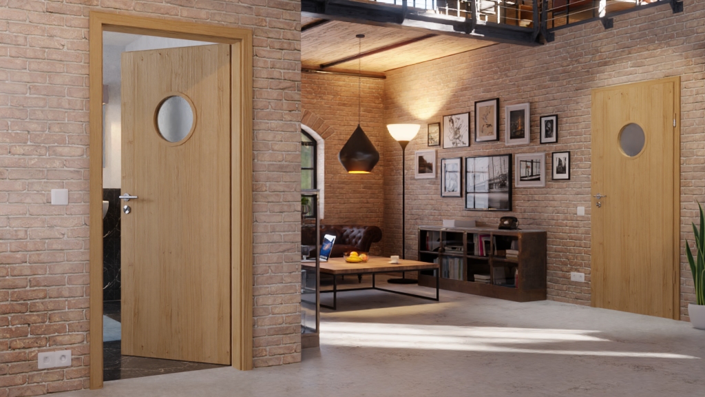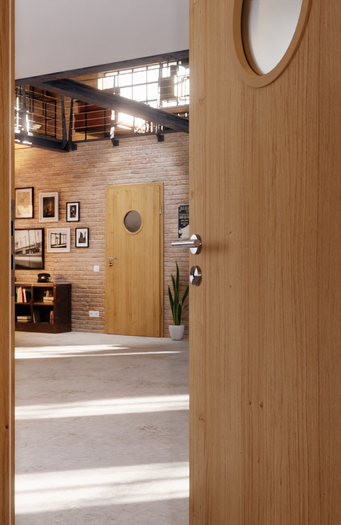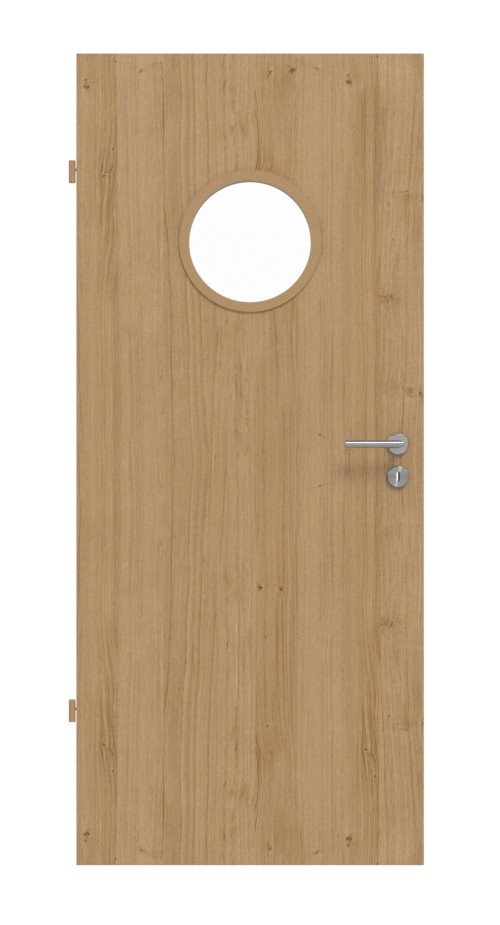 Harmonia drewnianych drzwi i wycięcia na szybę: Gładkie drzwi wewnętrzne Optima z okleiną w kolorze europejski dąb sękaty firmy Jeld-Wen łączą naturalny design z solidnym wykonaniem i przeszkleniem.
