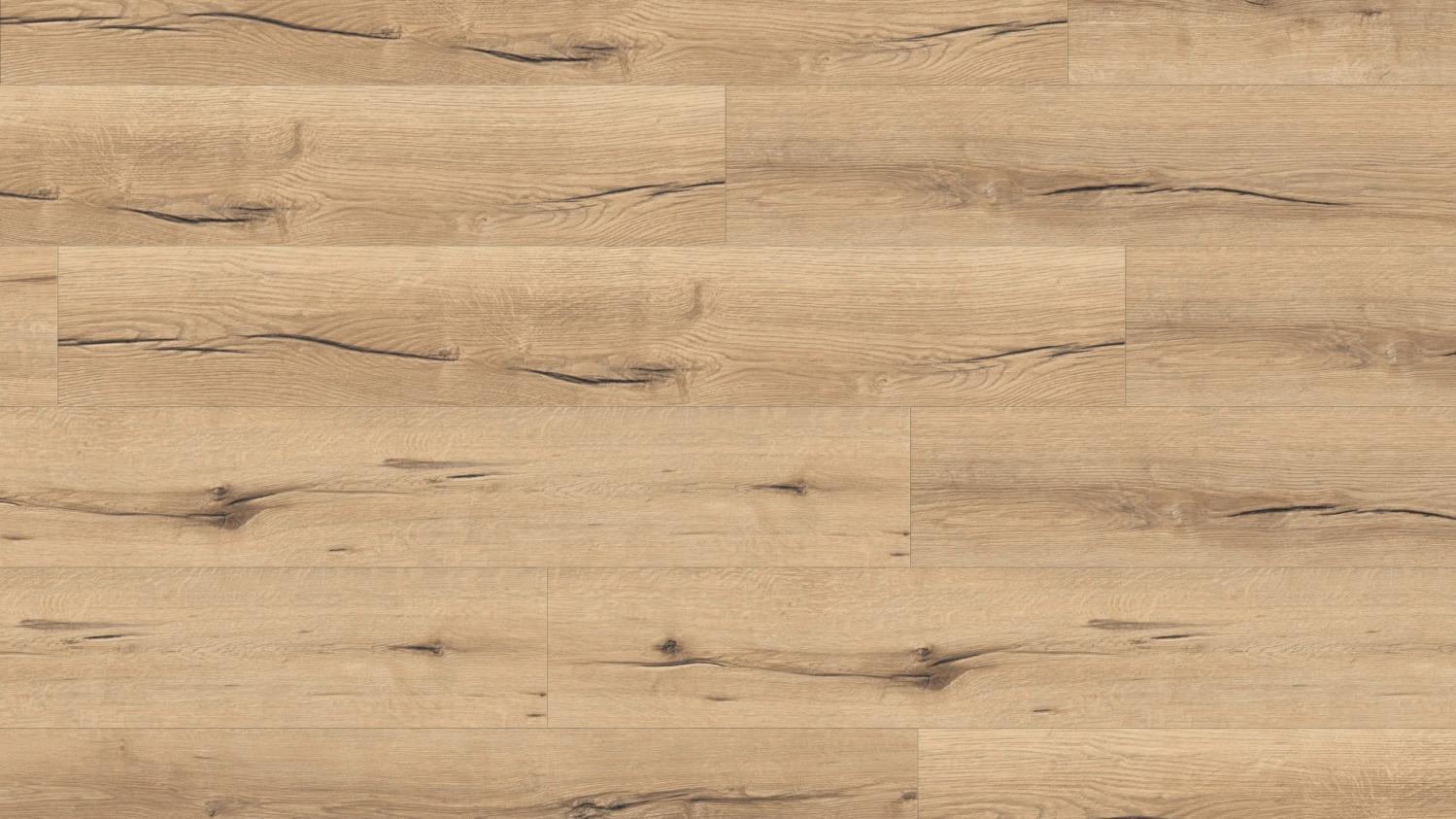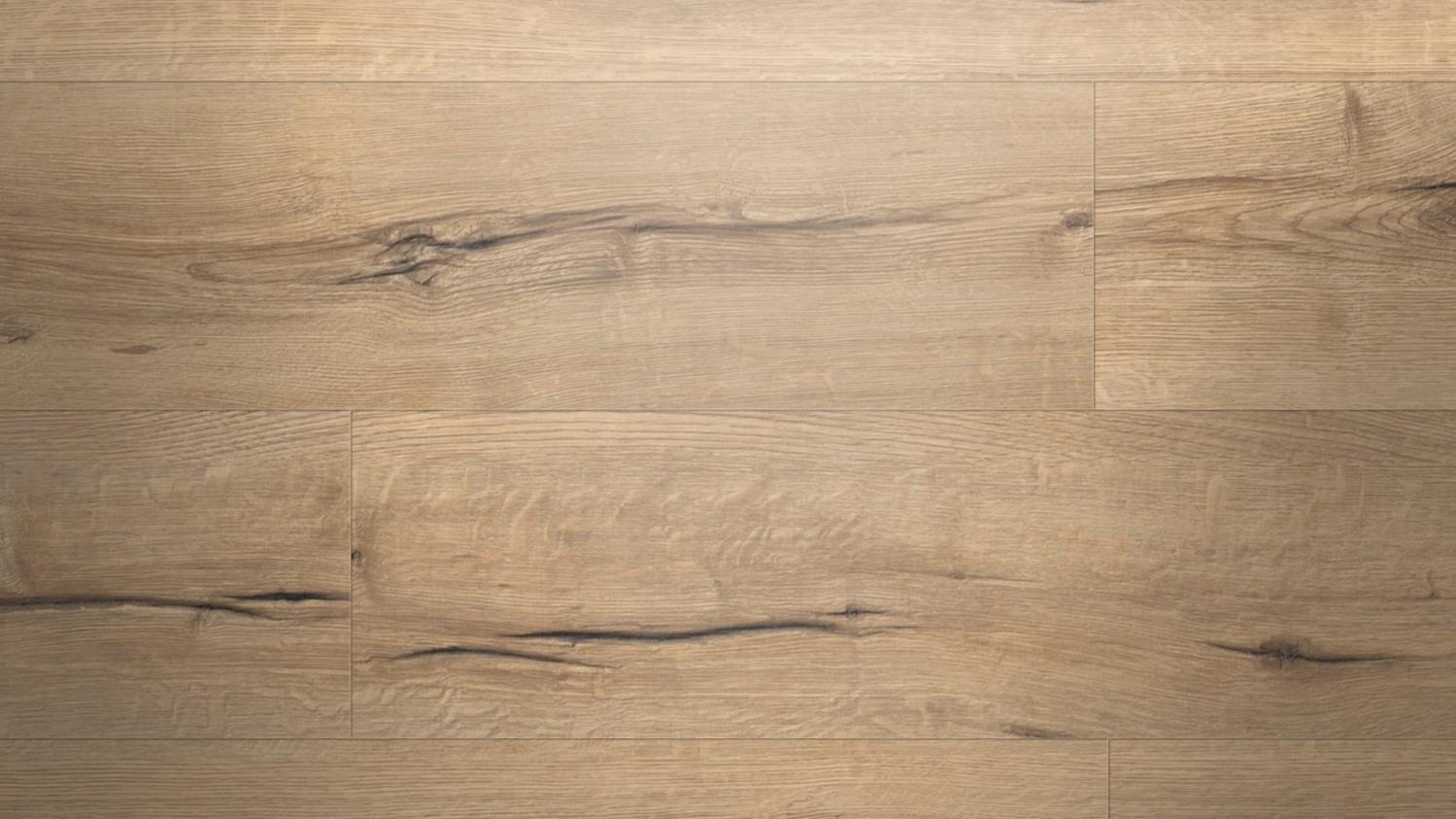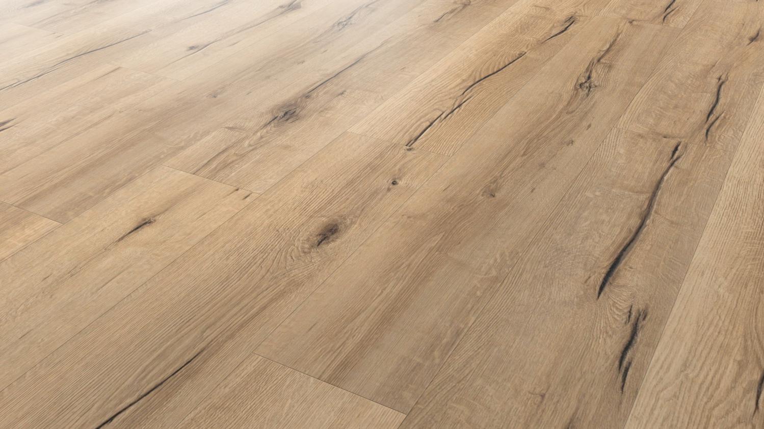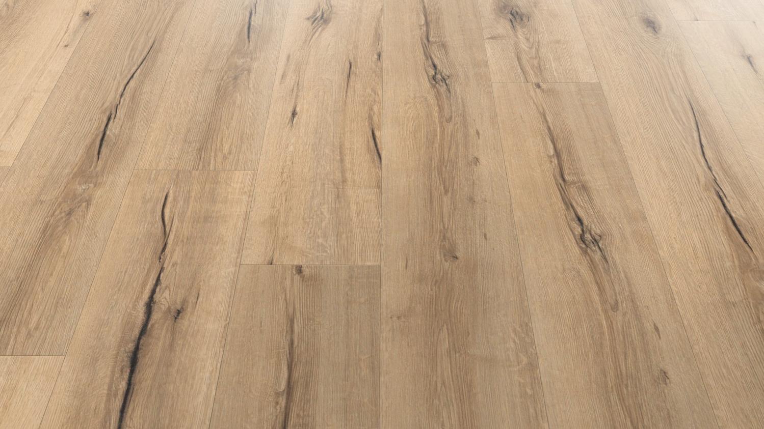 Deski w stylu rustykalnym w naturalnych odcieniach brązu i z fazą zapewniają przyjazną i ciepłą atmosferę. Wyraźne sęki i pęknięcia podkreślają naturalny wygląd tego charakterystycznego dębu.